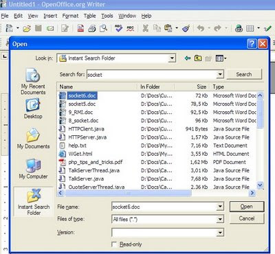 Do you ever open an application, click File/Open and wonder what's the location of that document with the latest sales report? You don't remember the filename, but you know some keywords from the document. You have Google Desktop, but you don't want to open a new window with the document. Besides, you are using OpenOffice, and the document will open with Microsoft Word.